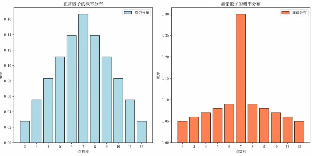 import numpy as np import matplotlib.pyplot as plt # 均匀骰子(正常骰子) dice_uniform = np.array([1/6] * 6) # 灌铅骰子A(6点概率50%) dice_A = np.array([0.1, 0.1, 0.1, 0.1, 0.1, 0.5]) # 点数1-6的概率 # 灌铅骰子B(1点概率50%) dice_B = np.array([0.5, 0.1, 0.1, 0.1, 0.1, 0.1]) # 点数1-6的概率 # 正常骰子的和:dice_uniform * dice_uniform sum_normal = np.convolve(dice_uniform, dice_uniform) # 灌铅骰子的和:dice_A * dice_B sum_loaded = np.convolve(dice_A, dice_B) sum_values = np.arange(2, 13) # 绘制对比图 plt.figure(figsize=(12, 6)) plt.rcParams['font.family'] = 'SimSong' # 设置中文字体 # 正常骰子分布 plt.subplot(1, 2, 1) plt.bar(sum_values, sum_normal, color='lightblue', edgecolor='black', label='均匀分布') plt.xlabel('点数和') plt.ylabel('概率') plt.title('正常骰子的概率分布') plt.xticks(sum_values) plt.legend() # 灌铅骰子分布 plt.subplot(1, 2, 2) plt.bar(sum_values, sum_loaded, color='coral', edgecolor='black', label='灌铅分布') plt.xlabel('点数和') plt.ylabel('概率') plt.title('灌铅骰子的概率分布') plt.xticks(sum_values) plt.legend() plt.tight_layout() plt.show()