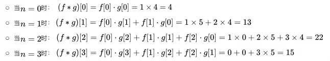无需积分后公式变得比较好理解,举个例子,若 , ,计算其卷积。因为索引越界其值为 0(如 ),因为k取值 0~2 即可,其计算步骤如下