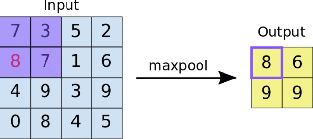 MaxPool 会对每个2x2的区域取最大值,经过这样设置的池化操作后,图像的尺寸会缩小一半,28x28 的输入通过一个 2x2 池化层后变为 14x14。