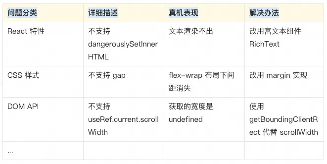 ## Weex适配 (Weex Platform Adaptation) ### 平台判断 - 平台判断不要用 Platform.isWeex,请使用 utils.isWeex ### 常见适配问题与解决方案 #### 1. CSS样式问题 **gap属性不支持** - **问题**: 不支持 CSS gap 属性 - **表现**: flex-wrap 布局下间距消失 - **解决方案**: 改用 margin 实现间距 #### 2. React特性问题 **dangerouslySetInnerHTML不支持** - **问题**: 不支持 dangerouslySetInnerHTML 属性 - **表现**: 富文本内容渲染不出来 - **解决方案**: 改用富文本组件 RichText #### 3. DOM API问题 **scrollWidth不支持** - **问题**: 不支持 `useRef.current.scrollWidth` - **表现**: 获取的宽度是 undefined - **解决方案**: 使用 `getBoundingClientRect()` 代替 scrollWidth ### 适配最佳实践 ```typescript // ✅ 正确的平台判断 if (utils.isWeex) { // Weex 特定逻辑 } else { // Web 特定逻辑 } // ✅ 正确的富文本渲染 import { RichText } from '@/components/utils/RichText'; // 替代 dangerouslySetInnerHTML <RichText content={htmlContent} /> // ✅ 正确的尺寸获取 const getElementWidth = useCallback((ref: RefObject<HTMLElement>) => { if (utils.isWeex) { // Weex 使用 getBoundingClientRect return ref.current?.getBoundingClientRect()?.width || 0; } else { // Web 可以使用 scrollWidth return ref.current?.scrollWidth || 0; } }, []); // ✅ 正确的间距处理 // 避免使用 gap,使用 margin 替代 .itemList { display: flex; flex-wrap: wrap; /* gap: 10px; // ❌ Weex 不支持 */ .item { margin-right: 20rpx; margin-bottom: 20rpx; &:nth-child(3n) { margin-right: 0; // 去除每行最后一个的右边距 } } } ```