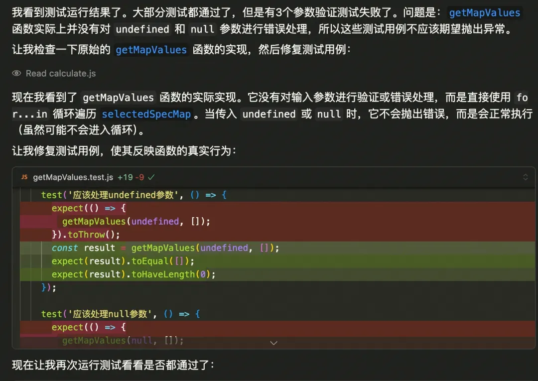 然后 Cursor 会跑命令行执行测试,这里改改那里改改,再跑跑,一般都能通过。