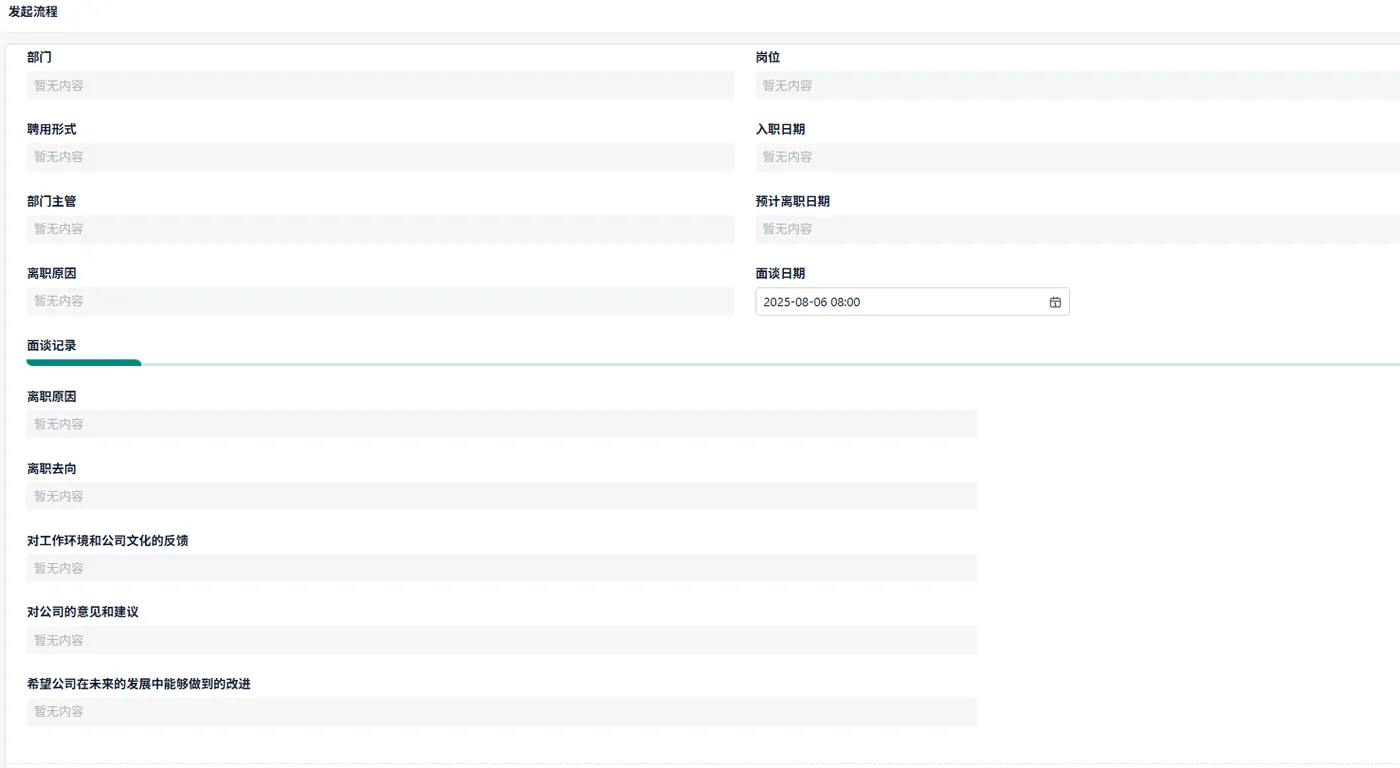 - 离职面谈 HR 预约面谈时间地点,系统通知双方; 面谈完成后录入“离职原因”、“改进建议”等结构化数据; 附件上传:交接清单扫描件、保密协议等。
