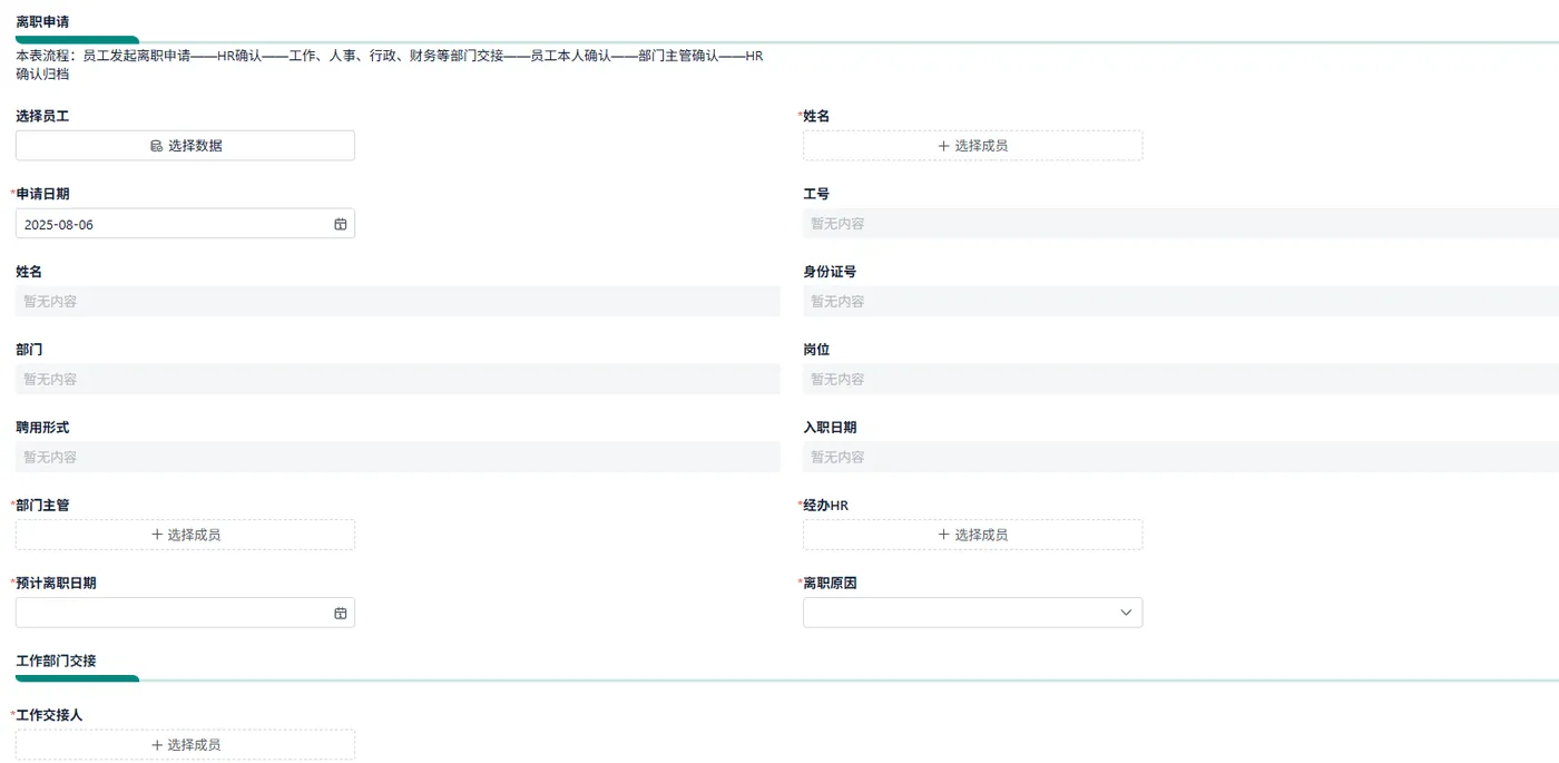 - 离职申请与审批 员工填写离职申请,选择离职类型(主动/被动)、日期与原因; 直属领导初审,HR 复审; 审批通过后,进入交接阶段。