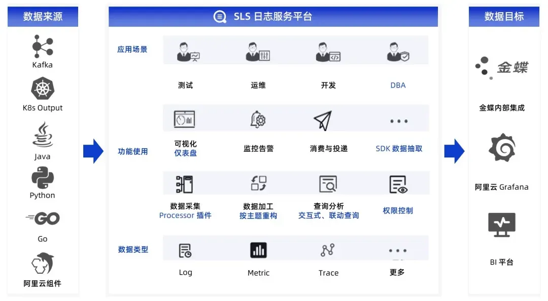 SLS 自研探针 Logtail,还支持统一采集存储可观测数据 Log、Metric、Trace 数据,支持用户通过 SLS 进行按主题重构、交互式、联动查询分析,支持数据冷热分层降低存储成本,通过 SLS 开放兼容接口对接用户不同业务平台。