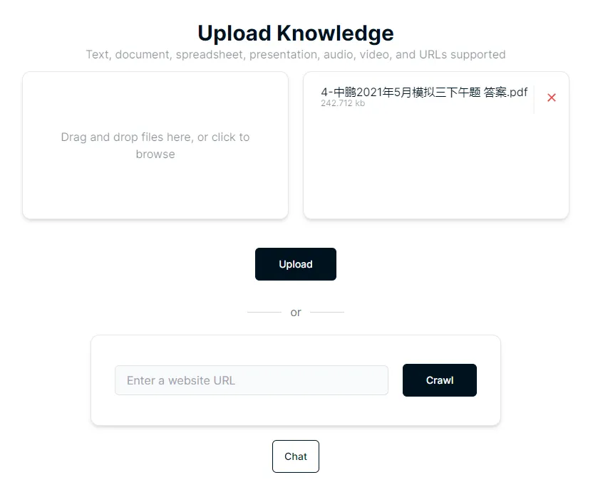 - 聊天式交互:与上传内容对话,支持上下文、历史记录管理、语义问答。