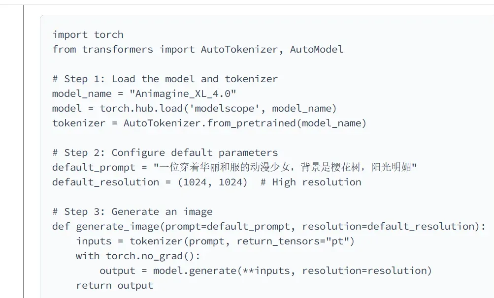 我需要一个高性能的文生图(Text-to-Image)模型,用于生成动漫风格插画,并自动构建完整的推理流程。要求:1.支持中文提示词,并具备高分辨率输出2.自动拉取模型及示例数据集(如动漫风格 LoRA 或配套提示词库)3.配置默认参数,并提供调整选项4.生成可直接运行的推理代码(Python 或 Notebook 格式)