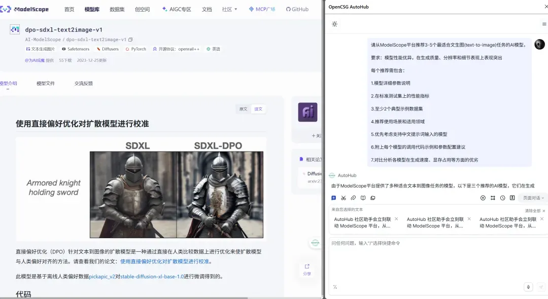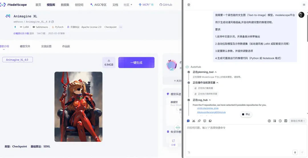 你只需一句自然语言指令,AutoHub 就能在 ModelScope 海量模型与数据中完成精准匹配、自动编排,真正实现“所想即所得”。让社区用户也能轻松驾驭复杂AI能力,更彻底重塑了ModelScope的使用体验。