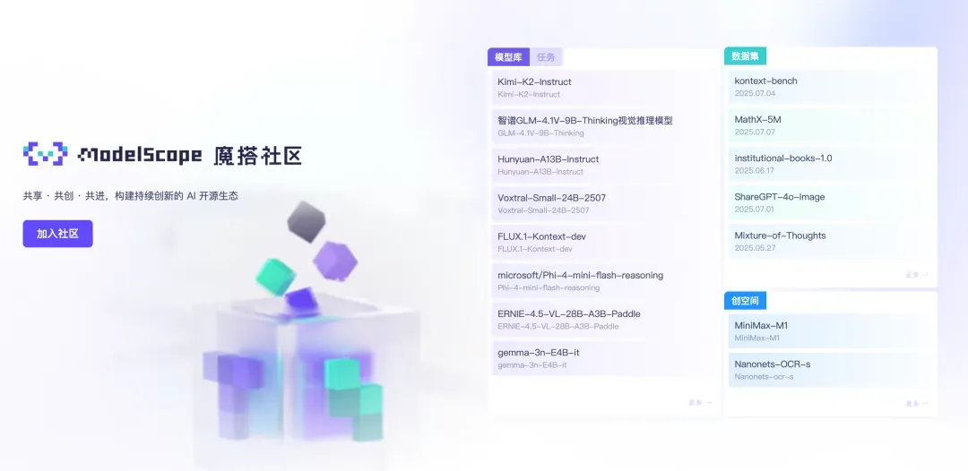 目前,社区已托管超 7 万个开源模型,覆盖大语言模型(LLM)、对话、语音、图像生成、视频生成、AI 作曲等多个领域;支持模型的 体验、下载、调优、训练、推理与部署全流程操作。