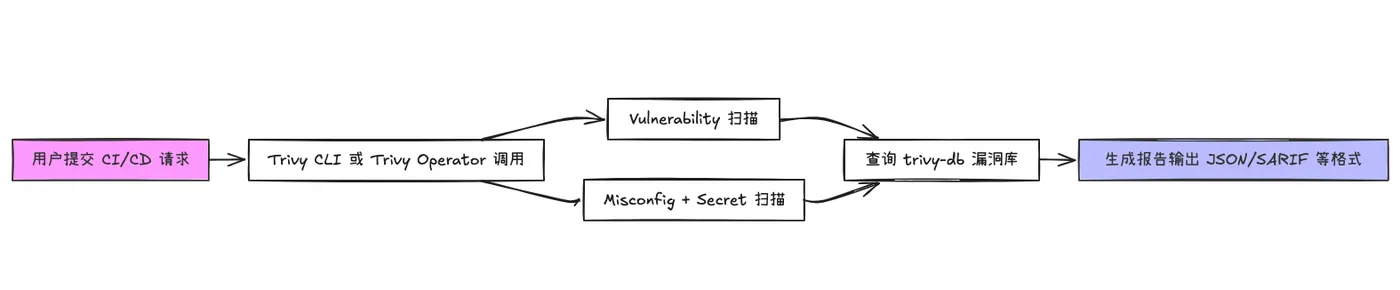 | CLI/Operator | CLI 可直接扫描镜像、文件系统等;Operator 可嵌入 Kubernetes 集群,实现自动触发扫描和报告生成。 |