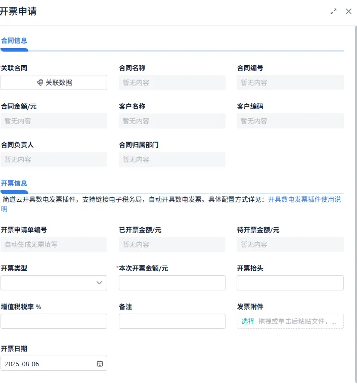 - 开票申请:内部人员发起开票,关联合同、填写税率、金额、抬头等;