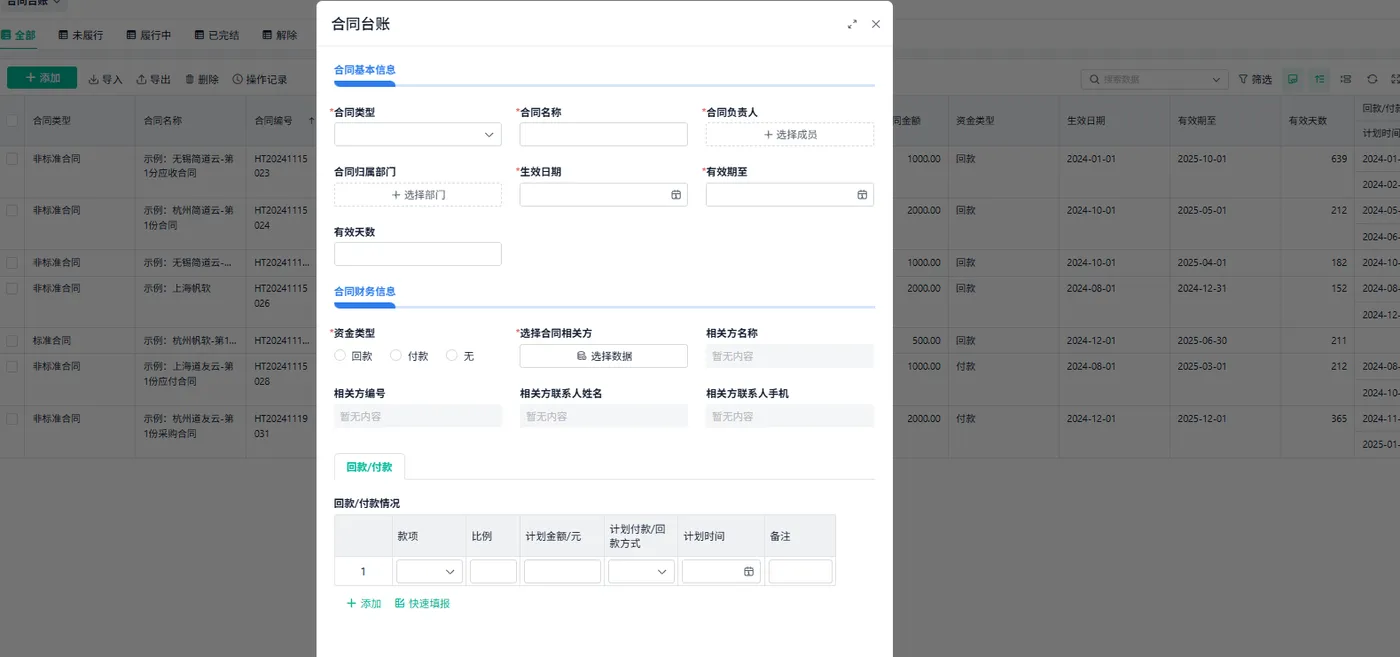- 合同台账:集中存储合同基础信息,如合同编号、甲乙双方、签订日期、有效期、合同类型等。