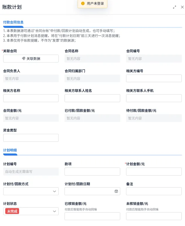 - 账款计划:根据合同约定,自动生成收款/付款计划;