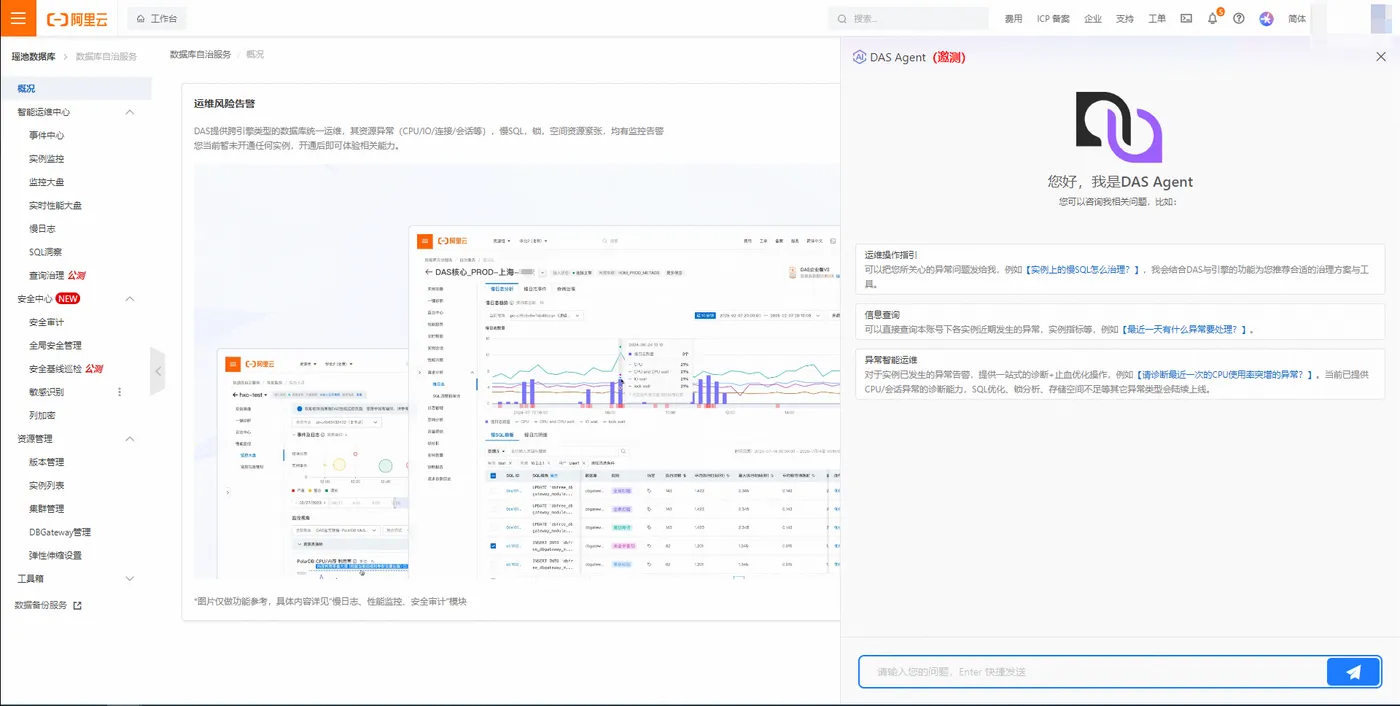数据库自治服务DAS是一种基于机器学习和专家经验实现数据库自感知、自修复、自优化、自运维及自安全的云服务,帮助消除数据库管理的复杂性及人为导致的故障,保障数据库服务的稳定、安全及高效。