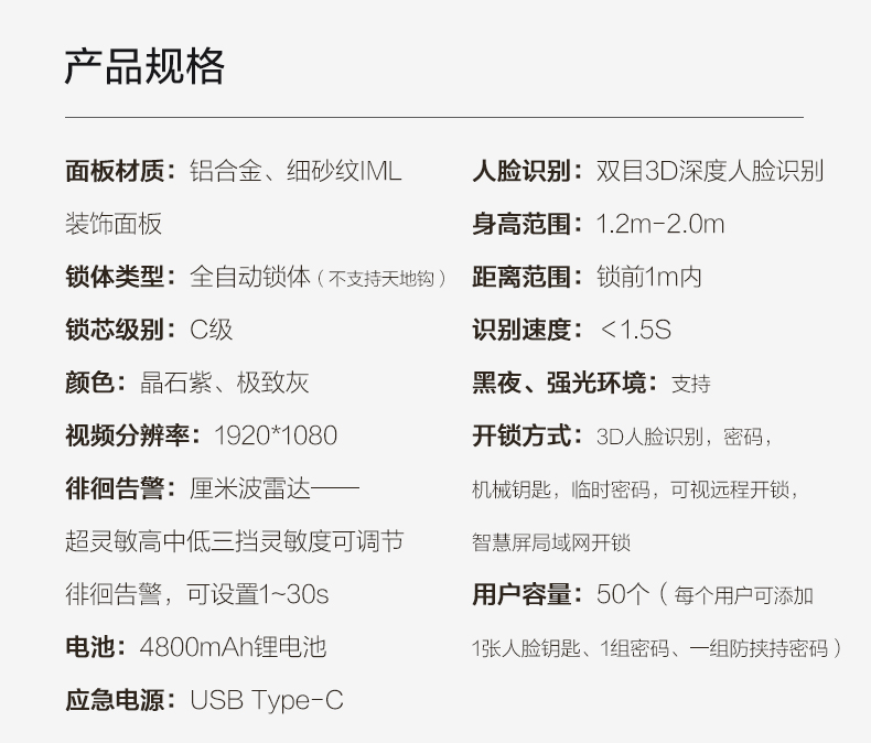 "propName": "1627207:30598841824:饰面颜色:Y3000FVS静谧黑【3D人脸+远程视频对讲+可视大屏+儿童出门检测】",