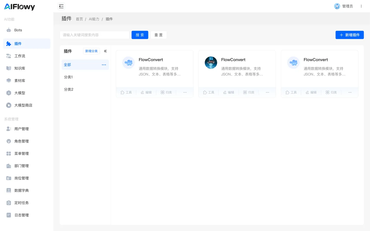 | AIFlowy | Java + React/Vue | ✅ 拖拽 | ✅ 图片/音/视频 | ✅ | ✅ | ✅ 用户/角色/日志 |