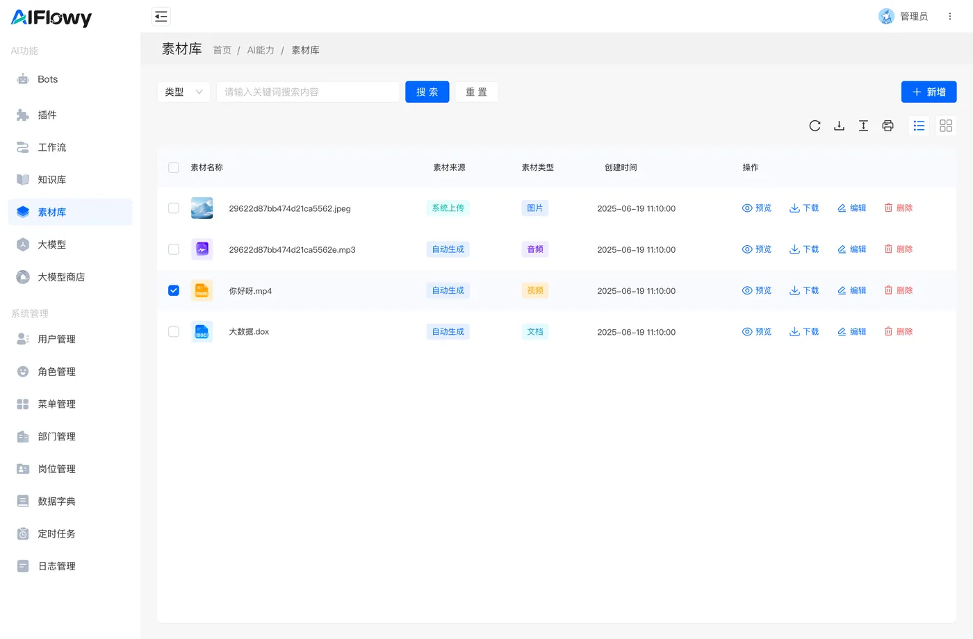 | 素材中心 | 一键生成图片/音频/视频,输出媒体资源 |