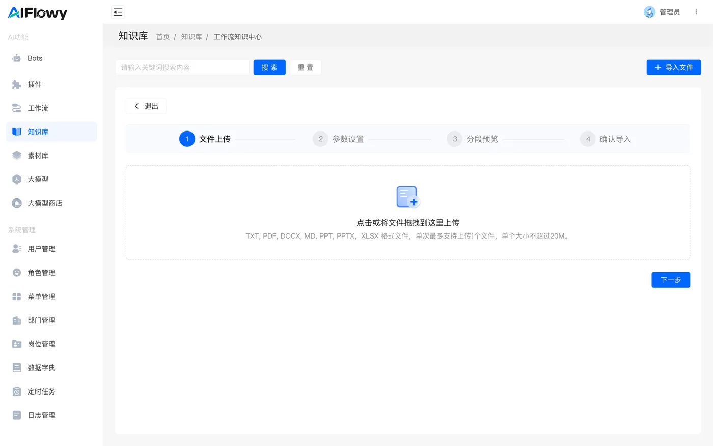 AI 工作流编排:拖拽组件(如“文本入口”“知识检索”“模型推理”)即可构建流程