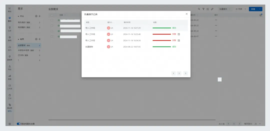 在云效的项目中导入工作项时,云效会首先提供一个 Excel 文件模板,这里需要将 Coding 的 Excel 文件内容复制到云效 Excel 文件,然后再进行导入。导入的进度可以在操作记录中查看,如果导入失败,云效也会提供日志文件展示失败原因,指导用户修改 Excel 文件,直至成功导入。