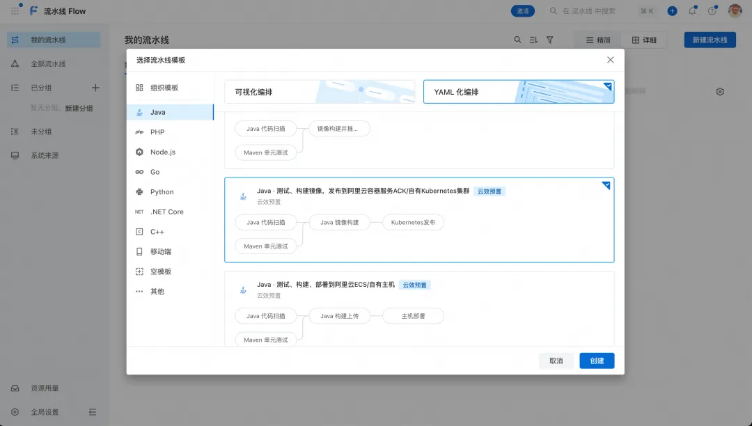 下面以代码源使用阿里云云效 Codeup、镜像制品源使用阿里云 ACR 为例,创建一条流水线。