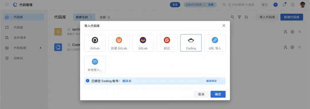 Codeup 提供了自动导入 Coding 代码库的功能,通过简单的配置,就可以将 Coding 代码库一键迁移到 Codeup。