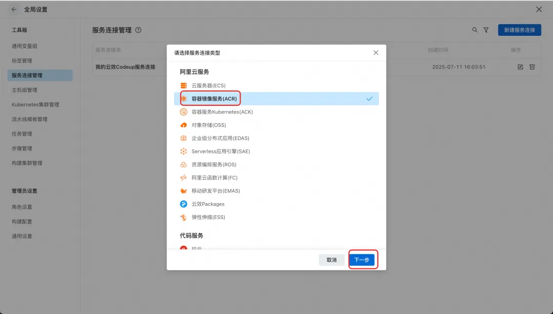 创建 Codeup 服务连接—>创建阿里云 ACR 的服务连接—>创建流水线。
