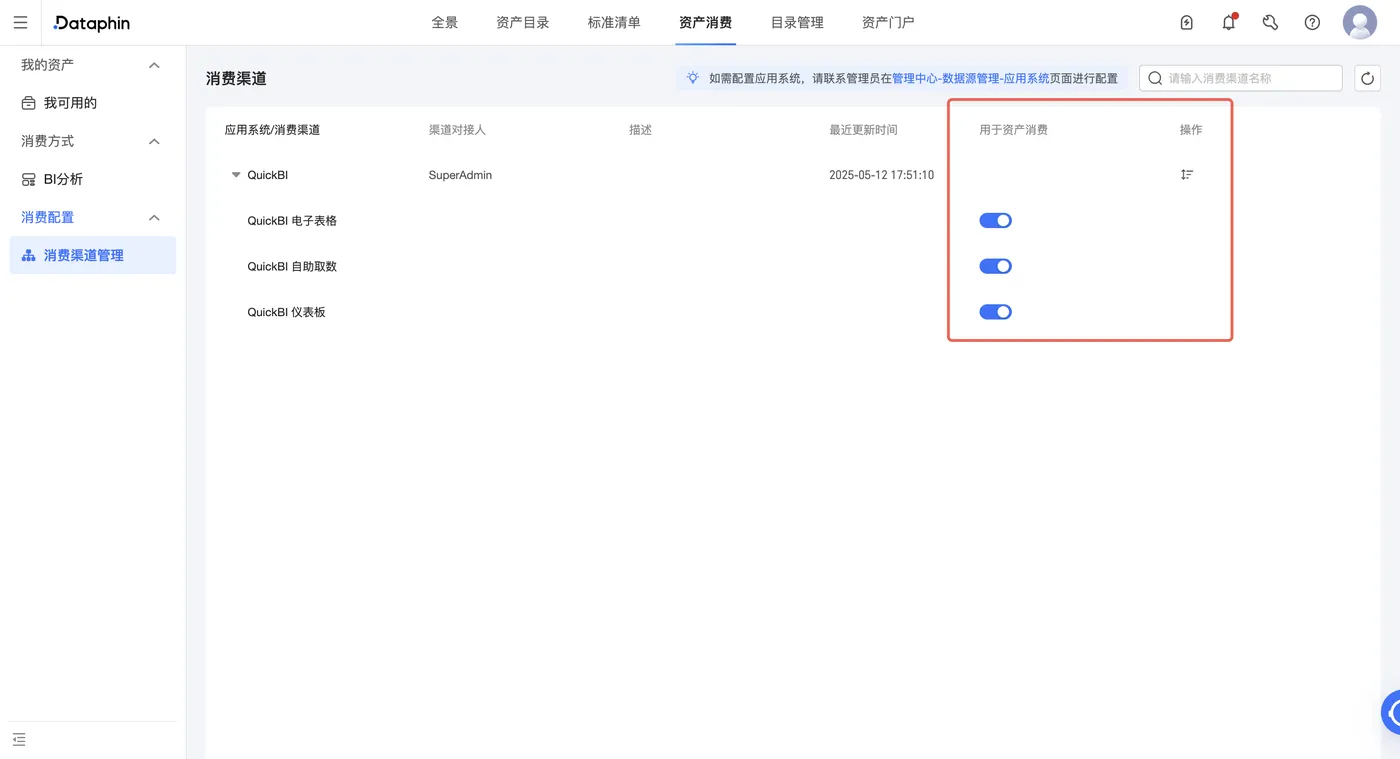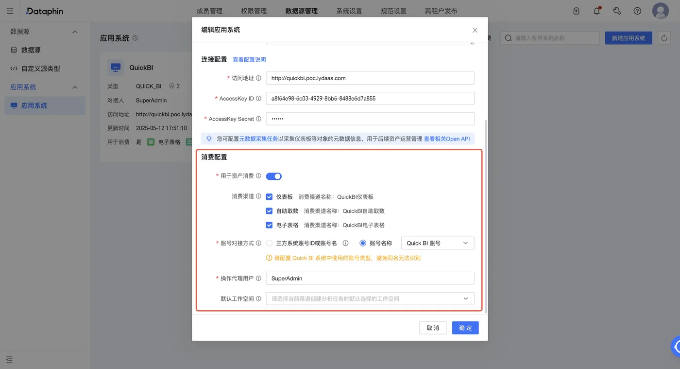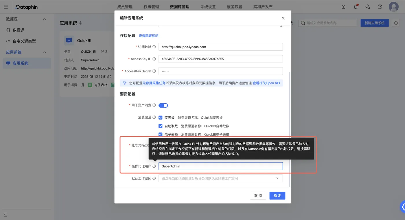 - 在「管理中心」-「数据源管理」-「应用系统」中,为应用系统打开「用于资产消费」开关,根据需要配置QBI支持的消费渠道、账号对接方式和操作代理用户等。