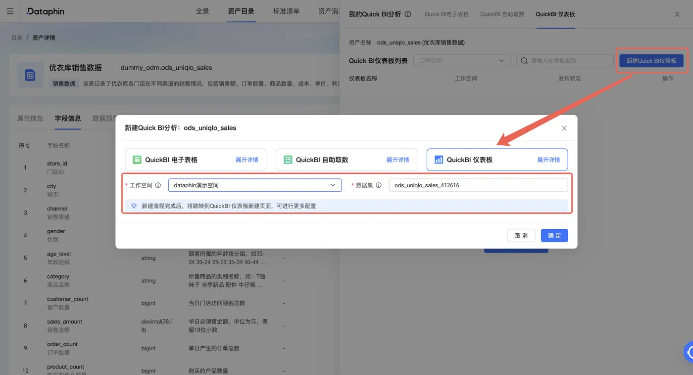 这里以仪表板为例,我们可以选择有分析权限的工作空间,系统会根据当前表在选中工作空间下是否已创建过对应的数据集,新建或继续沿用,实现数据集的统一管理。