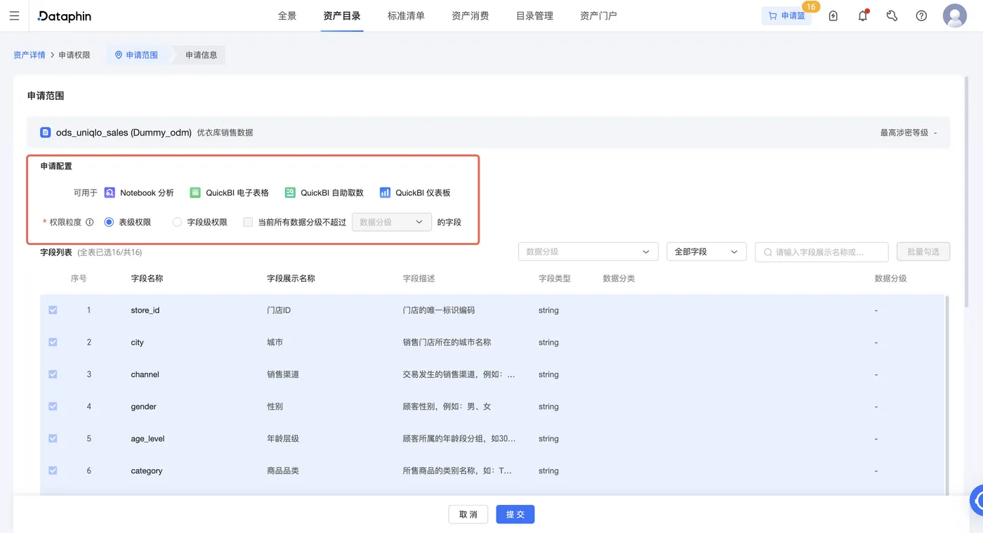 - 接下来,我们可以在资产目录中选择想要分析的数据表进行权限申请。