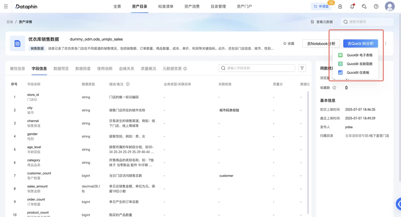 - 权限申请成功之后,我们可以在资产详情点击「去QuickBI分析」,选择相应的分析渠道。