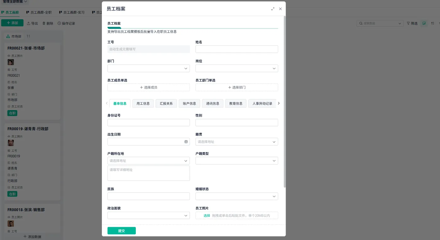 功能:员工基本信息、合同、证照、培训记录、资格证书、历史任职记录、家庭信息、紧急联系人。