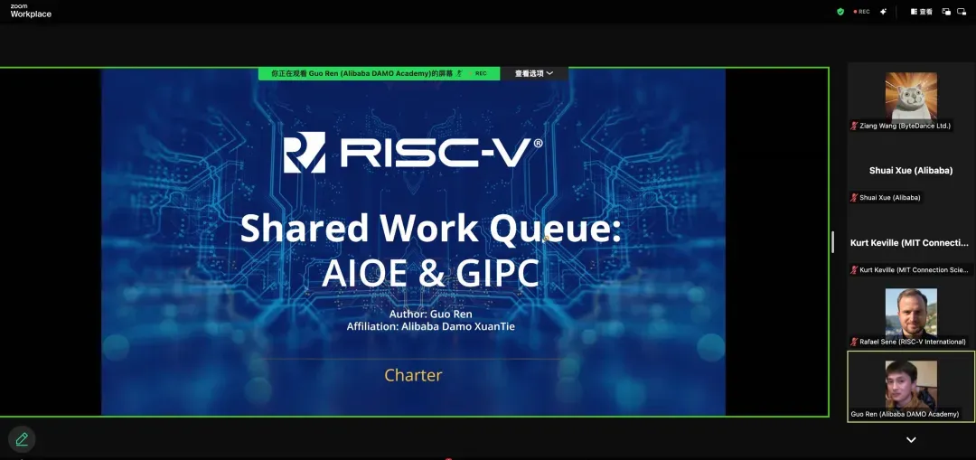 会议上还重点讨论了下一步推进流程问题。来自 RISC-V 国际基金会的 Rafael,就后续是否要正式提案成为任务组(TG)还是仅作为数据中心 SIG 内部跟进讨论。对此,郭任和宋卓表示,后续会在 Data Center SIG 成立和孵化 SHWQ TG (Shared Hardware Work Queue Task Group) ,用于推进 RISC-V 的共享硬件队列技术标准的发展,譬如:AIOE、GIPC 等扩展。Rafael 表示会发邮件提供相关的指引,详细说明具体步骤。