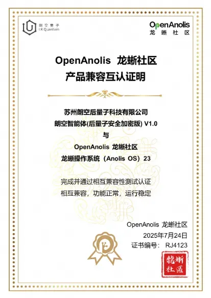 朗空量子提供一套基于 PQC(后量子密码)和 AI 的后量子安全基础设施,其产品体系核心是独创的“朗空量子护盾”后量子敏捷框架,支持传统密码(如 ECC)与后量子密码的混合使用,以实现平滑、安全的迁移。朗空量子产品线全面覆盖基础技术、基础产品和行业应用:推出 AI 迁移助手、密码卡、加密机、安全网关等硬件,为政务、金融、云、物联网提供定制方案,已成功保障 Qwen、DeepSeek 等大模型通信安全,并完成 Hyperledger Fabric 系统后量子迁移。朗空量子加入龙蜥社区,一直在操作系统内核级密码模块升级、提供全栈安全支持、分布式操作系统的后量子迁移等方面与龙蜥保持合作。2025 年 7 月, 朗空量子朗空智能体(后量子安全加密版)V1.0 产品与龙蜥操作系统 Anolis OS 23 完成了相互兼容性测试认证,结果显示:相互兼容,功能正常,运行稳定。