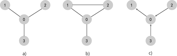 图 1 中,c) 是有向图,无法被看做是树型结构。重点观察 a) 和 b),它们都是无向图,并且各自包含的顶点都是相互连通的,唯一的不同在于,b) 中存在 1-0-2-1 这条环路,而 a) 中不存在环路,因此 a) 既可以看做是一张图,也可以看做是一棵树;而 b) 只能看做是一张图。