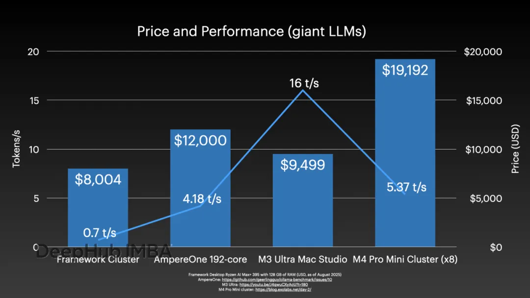 配备512GB内存的M3 Ultra Mac Studio售价接近10,000美元,但其性能表现显著优于测试集群,可达到16 tokens/s的推理速度。