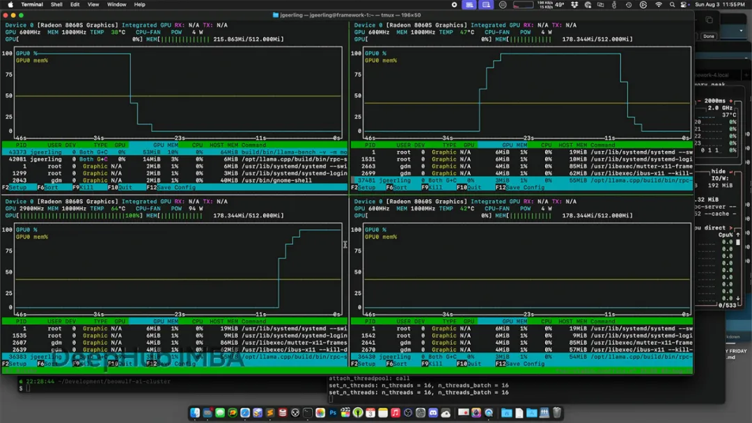 系统组装完成后,进行了全面的性能评估测试。完整的测试数据已在GitHub相关仓库中详细记录,包括Framework Desktop的sbc-reviews完整数据、top500 HPL基准测试结果以及Ollama和LLM基准测试结果。