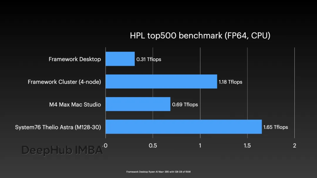 四节点集群配置下,即使未进行针对Ryzen AI Max+芯片特性的专门优化,运行top500-benchmark测试仍能实现超过1 TFLOP的FP64浮点计算性能。