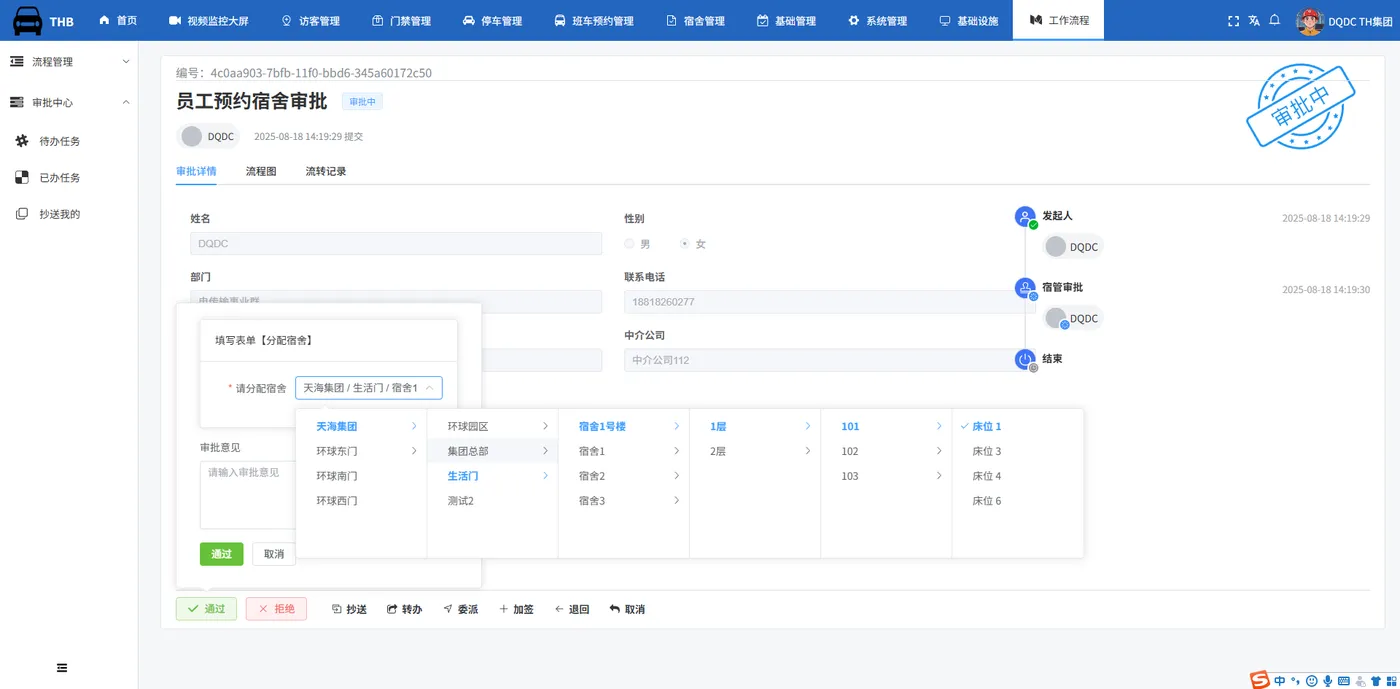 这里的bedId就是我们刚刚配置好的字段唯一id,这段代码会找这个bedId是否有值,如果有值的话就转化成一个Long类型的数组,因为是级联选择器所以传过来的包含所有的路径id,我们只需要倒数第一位(床位号),倒数第二位(宿舍号)即可,把这两条数据放入到实体类里即可,这样在审批时需要填写表单的功能就做完了。
