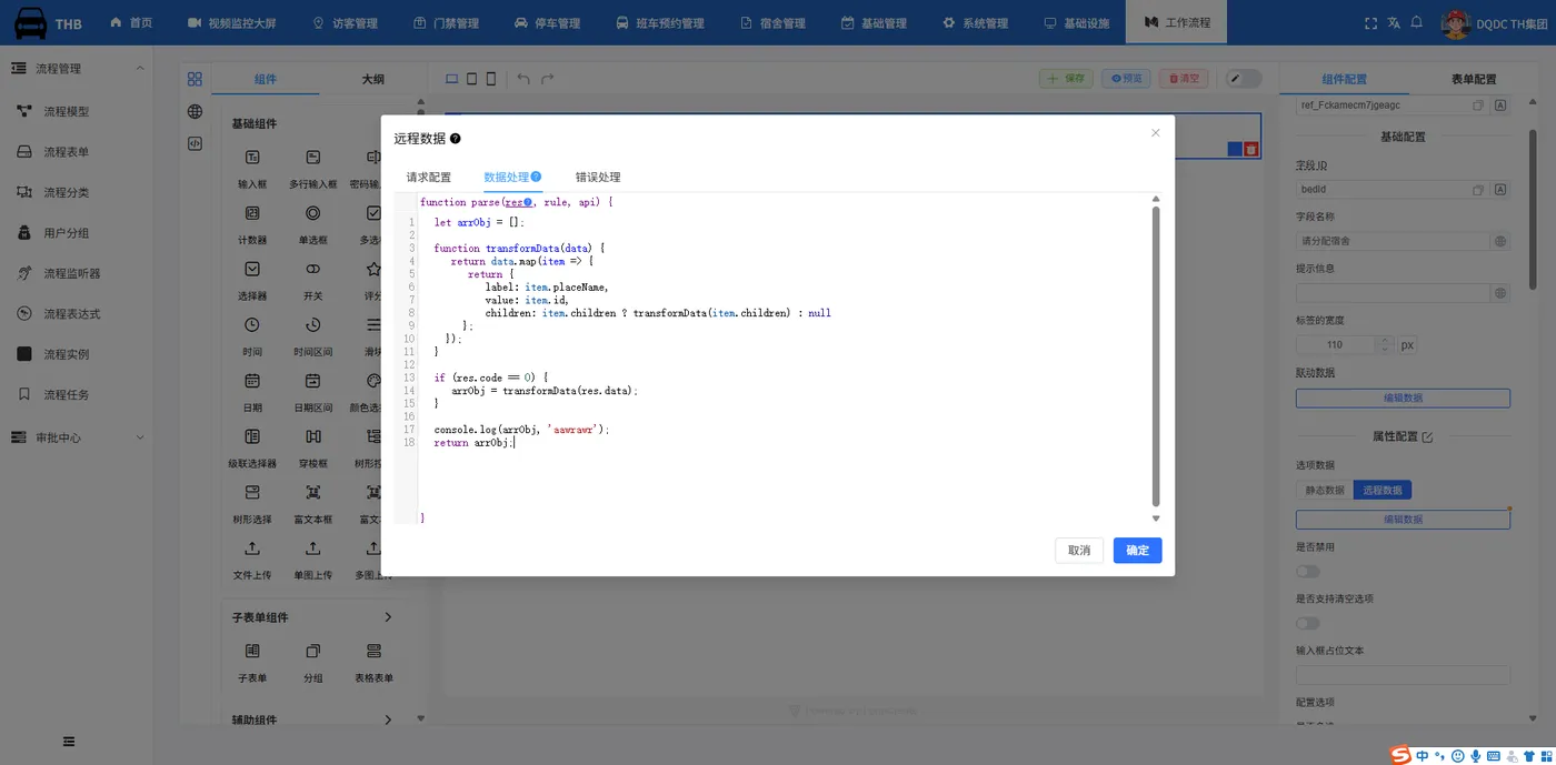 这个方法是把后端传过来的树状结构进行处理,比如我后端的场所名字是placeName,但是这里就必须转换成label,把id转换成value,需要和这里的字段对应,名字就是label,值是value,子节点是children,而且这串代码还把children里面的数据也转换成label和value的形式。如下图: