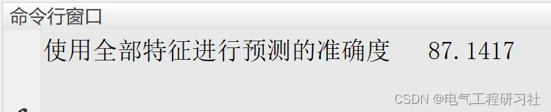 使用templateTree和fitrensemble这两个函数建立随机森林,并先使用全部的特征进行车辆经济性进行预测。输入为【气缸数目,排量,马力,重量,加速度,车辆年份,原产地】,输出为【车辆经济性】,随机森林中的决策树数量设置为100。训练模型并进行预测分析,具体结果如下,使用全部特征进行预测的准确度为87.1417.