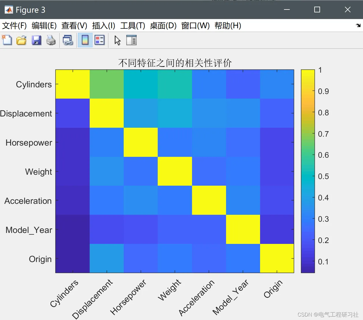 当随机森林评价完成特征的重要性后,还需要对各个特征变量之间的相关性进行评估,以更加明显的看出何种特征最能影响预测结果,使用皮尔逊系数作为各个特征变量之间的相关性评价指标,从下图可以看出,越接近黄色表示相关性越强。