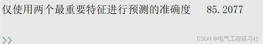 可以看到,使用两个特征进行预测的准确度为85.2077,与使用所有特征进行预测的准确度相差不大,这表明随机森林特征选择方法有效的选择出了最重要的特征,实现了从大量特征到少数重要特征的特征降维筛选,极大的降低了特征的冗余性。