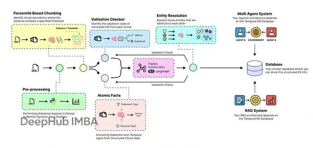 本文介绍的系统采用六层架构设计:语义分块模块将大型原始文档分解为具有上下文意义的文本单元;原子事实提取模块使用大语言模型读取每个文本块并提取原子事实、时间戳及相关实体;实体解析模块通过自动识别和合并重复实体(如"AMD"与"Advanced Micro Devices")来清理数据;时序失效模块在新信息到达时智能识别并解决矛盾,将过时事实标记为"失效"状态;知识图构建模块将最终的、清洁的、带时间戳的事实组装成AI智能体可查询的连接图结构;优化知识库模块将最终的动态知识图存储在可扩展的云数据库中,创建可靠且实时更新的知识基础,为RAG或智能体系统提供支撑。