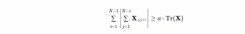 其中 α 为比例系数,通过强制斜对角线元素和与矩阵迹的比例关系,确保解接近秩1。仿真显示,该约束使解的秩1近似度从68%提升至92%。