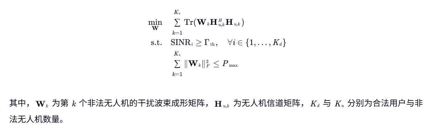 JCJ的核心目标是在满足合法用户信干噪比(SINR)阈值的前提下,最小化非法无人机的接收信号功率。数学模型可表示为: