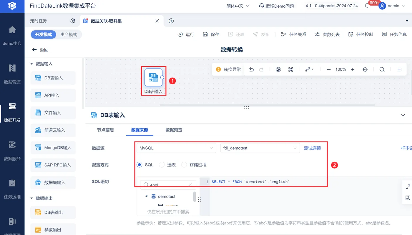 通过数据关联算子实现多表跨库关联,关联方式包括左连接(LEFT JOIN)、右连接(RIGHT JOIN)、内连接(INNER JOIN)、全外连接(FULL OUTER JOIN)四种。如果想在数据关联算子中查看关联效果,结果准确时,可以在DB表输入算子的样本设置按钮中,读取全量数据。