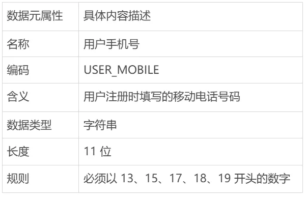 举个例子,“用户手机号”就是一个典型的数据元,它的定义得写清楚: