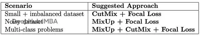 在技术选择和组合方面,CutMix适用于需要保持空间结构完整性的视觉任务,特别是当图像中每个目标区域都具有重要意义时。MixUp则更适合处理具有较强噪声干扰的数据集,通过平滑决策边界来提升模型的泛化能力。Focal Loss作为损失函数层面的解决方案,确保模型在训练过程中给予少数类样本足够的关注度。