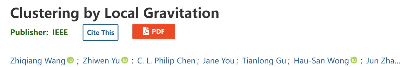 [2]Z. Wang et al., "Clustering by Local Gravitation," in IEEE Transactions on Cybernetics, vol. 48, no. 5, pp. 1383-1396, May 2018, doi: 10.1109/TCYB.2017.2695218.