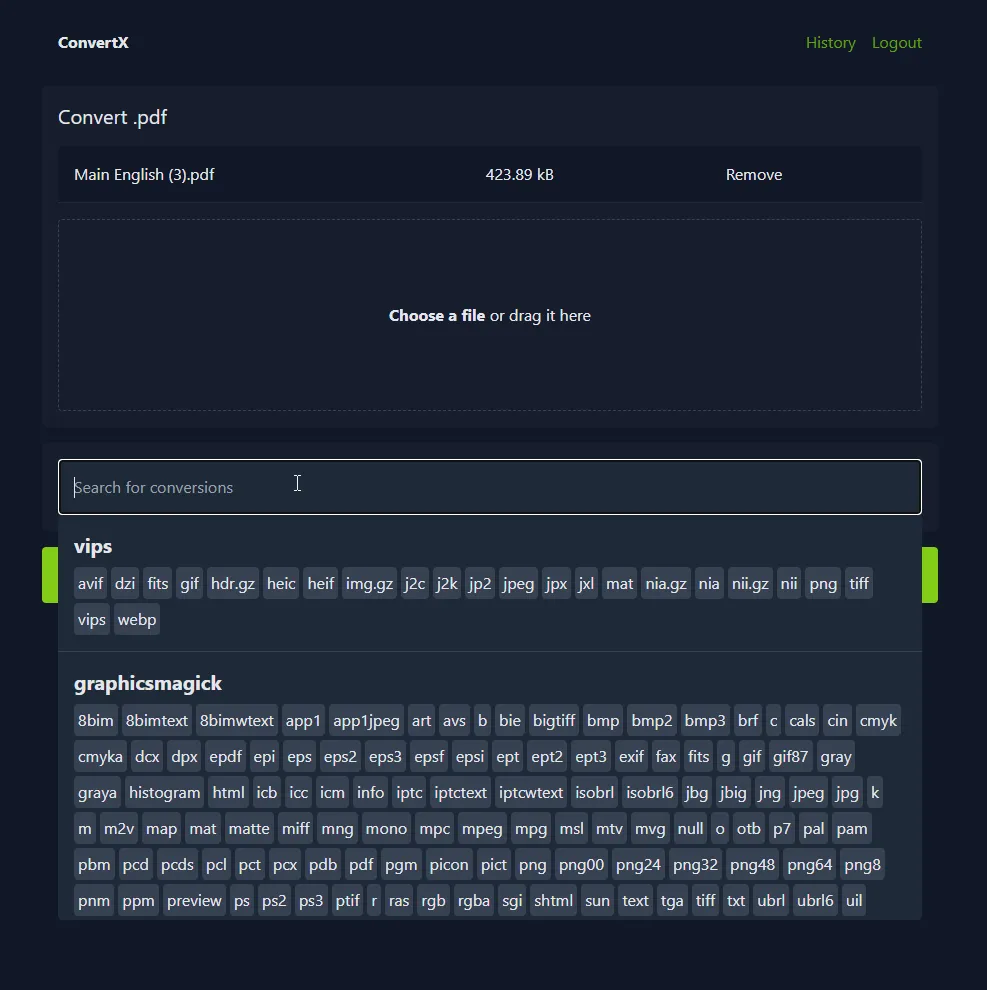 - 支持 1000+ 格式转换:包括视频(FFmpeg)、文档(Pandoc)、图像(GraphicsMagick/Vips/Inkscape)、3D(Assimp)、LaTeX 等 。