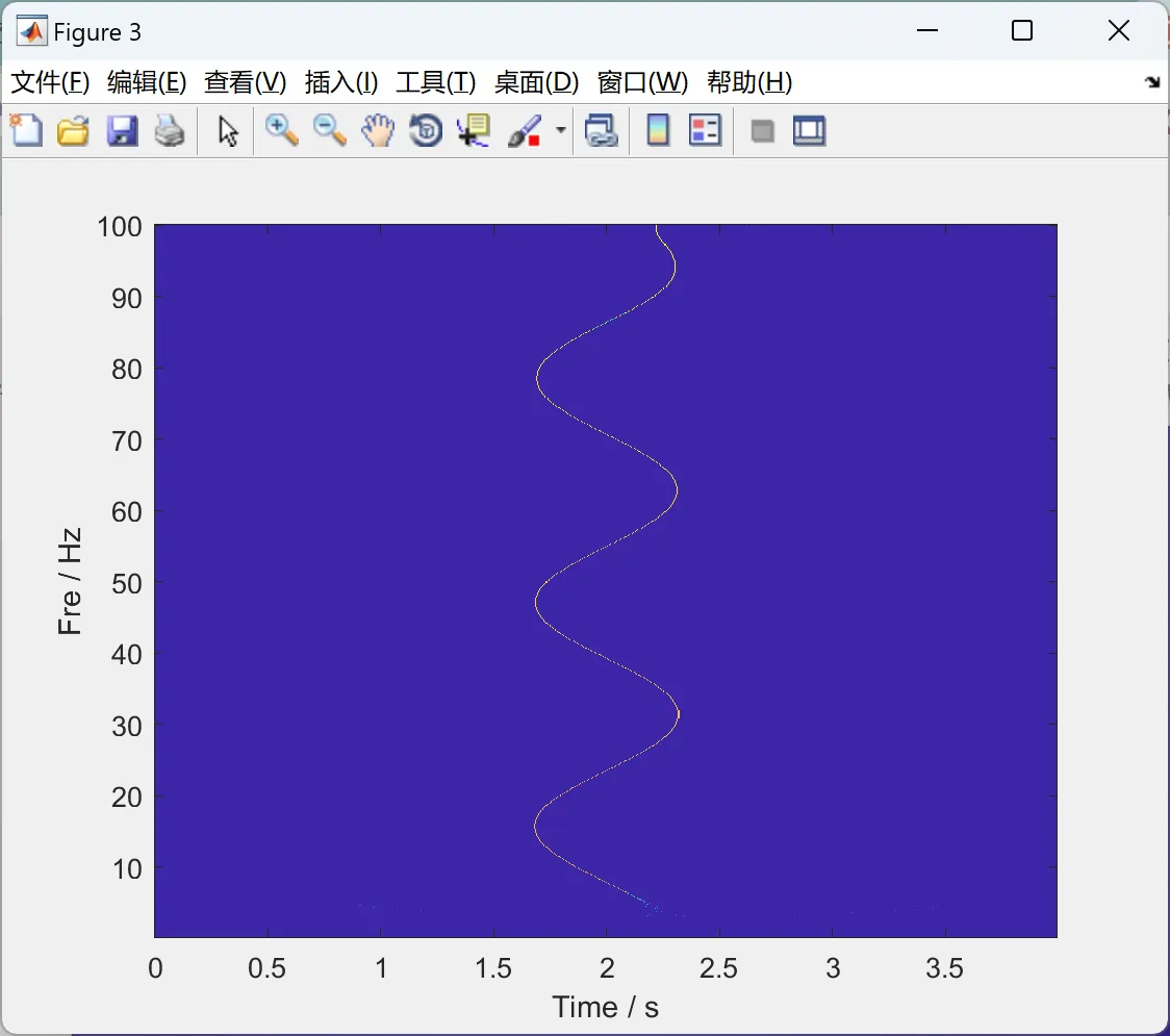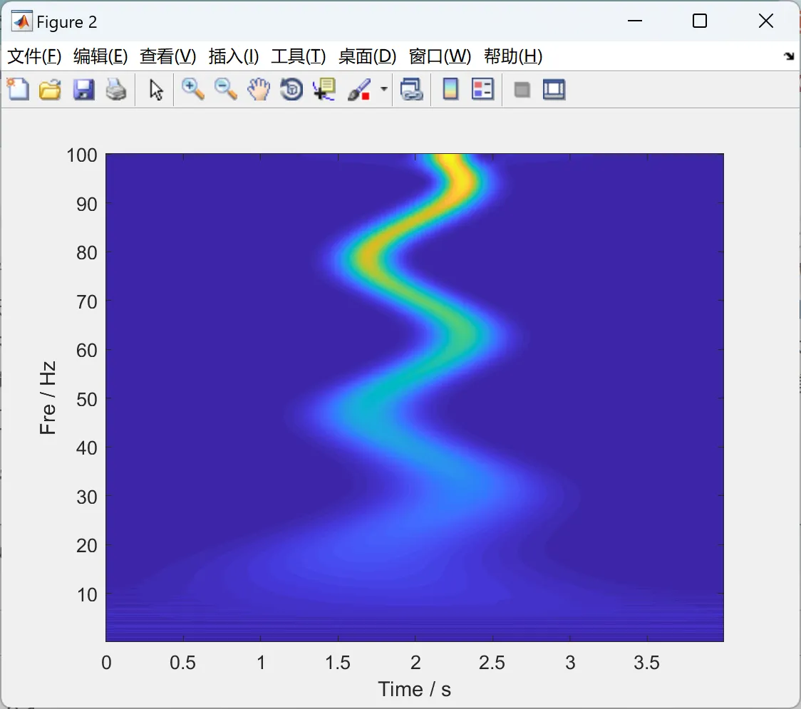 clc; clear; close all; %% Parameters N = 800; fs = 200; f = (0:N/2)*fs/N; t = (0:N-1)/fs; num = 1; %% Test Signal %Mode1 A_f2 = exp(0.002*f); Phi_f2 = -6*f+1.6*sin(0.2*f); X2 = A_f2.*exp(-1i*2*pi*Phi_f2); X2(end) = -A_f2(end); Y2 = [X2 conj(fliplr(X2(2:end-1)))]; y2 = ifft(Y2); %Mode2 y=y2; figure; plot(t,y) ylabel('Amp / v') axis([0 5 -0.1 0.1]); [Ws1,Wx1,tau1,as1] = WTMSST_Z(y',0.001,'cmor12-2',1000,10); [Ws2] = WTMSST_Z(y',0.001,'cmor12-2',1000,10); fre=scal2frq(as1,'cmor12-2',1/fs); figure imagesc(t,fre,abs(Wx1)) ylabel('Fre / Hz'); xlabel('Time / s'); axis xy